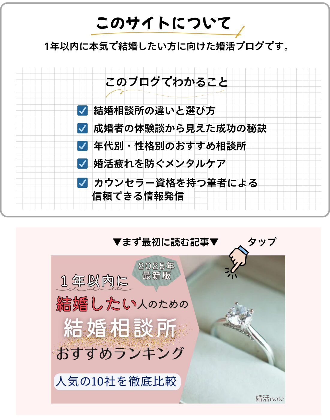 \リアル婚活の声/ 婚活ノート独自調べの体験談集35歳独身女性は結婚できる?5人の成功と失敗が分かれたリアル体験談も!35歳の独身女性は結婚できるのか── 周囲の結婚ラッシュ、出産リミットへの焦り… しかも35歳で彼氏もいないと「今からどうあがいたら結婚できるの?」と不安にさいなまれているのはあなただけではありません …【7人の本音レビュー】オーネットの口コミはやばい?悪い評判・デメリットから真実を徹底検証!そこで本記事ではオーネットのリアルな口コミ・評判を忖度なしにお伝えします! 良い口コミだけでなく、悪い評判やデメリットまで隠さずにお伝えします。 また、実際にオーネットを利用した7人の体験談もぜひ参考 …【3人のガチ体験談公開】ツヴァイの評判はやばい?悪い口コミ・デメリットを徹底検証!本記事では、ツヴァイのリアルな口コミ・評判をつつみ隠さずに検証していきます。 良い口コミだけでなく、悪い口コミやツヴァイの気になる点までぶっちゃけます! 中盤では実際にツヴァイを利用した3名の体験談も …【独自調査】大手結婚相談所9社のリアル体験談まとめ|決め手・サポート・成婚エピソードを一挙公開!結婚相談所に興味はあるけれど、「本当に成婚できるの?」「カウンセラーってどんな人?」など、不安や疑問を持っている方は多いはず。 そこで婚活ノートでは独自で結婚相談所の体験談調査を実施。 結選んだ決め手 … ▼年代別のおすすめ記事をチェック 20代におすすめの記事30代におすすめの記事40代におすすめの記事 ▼カテゴリから記事を探す▼おすすめの結婚相談所結婚相談所の口コミ・体験談結婚相談所比較地域別相談所恋愛テク 婚活疲れ・マインド自治体婚活支援運営者情報
